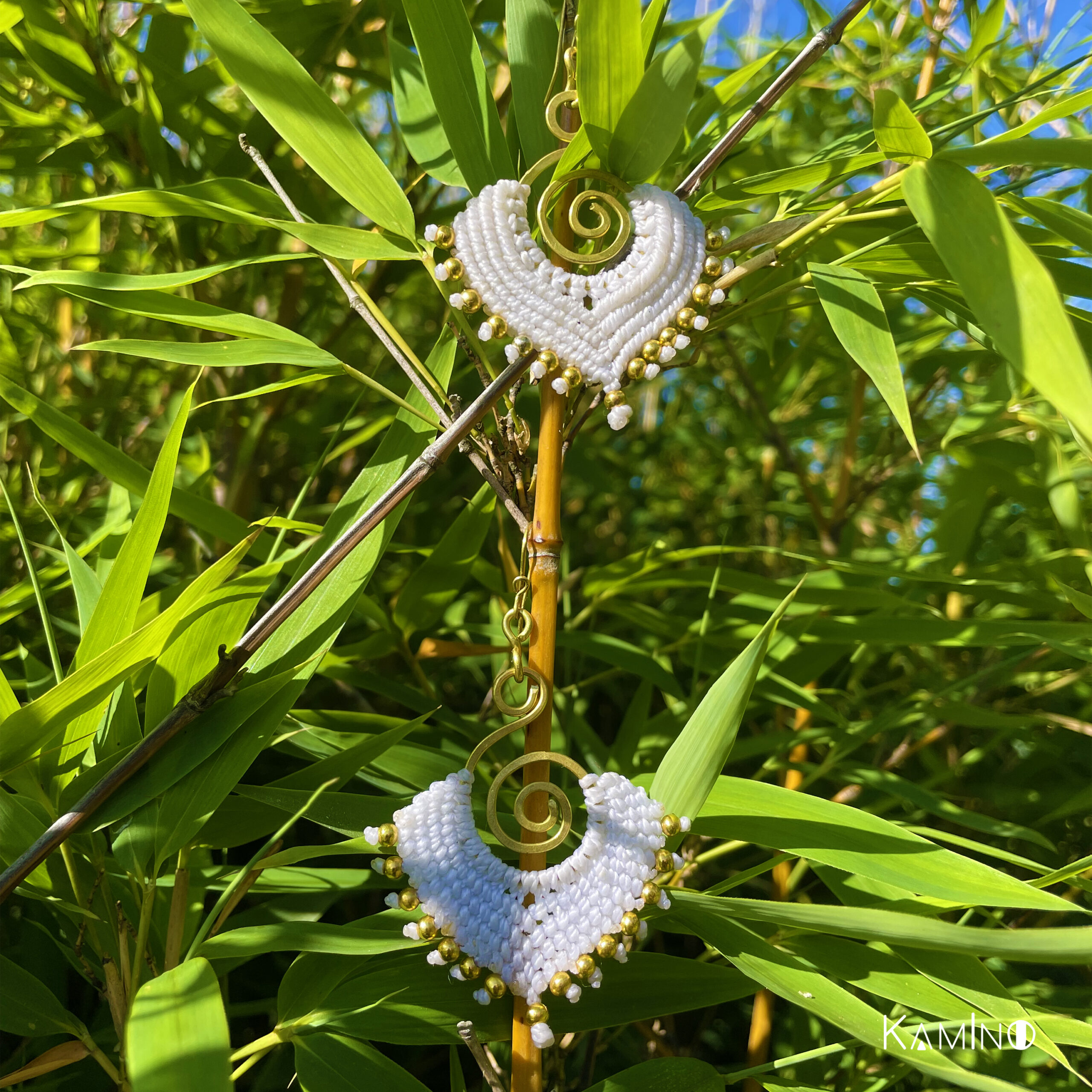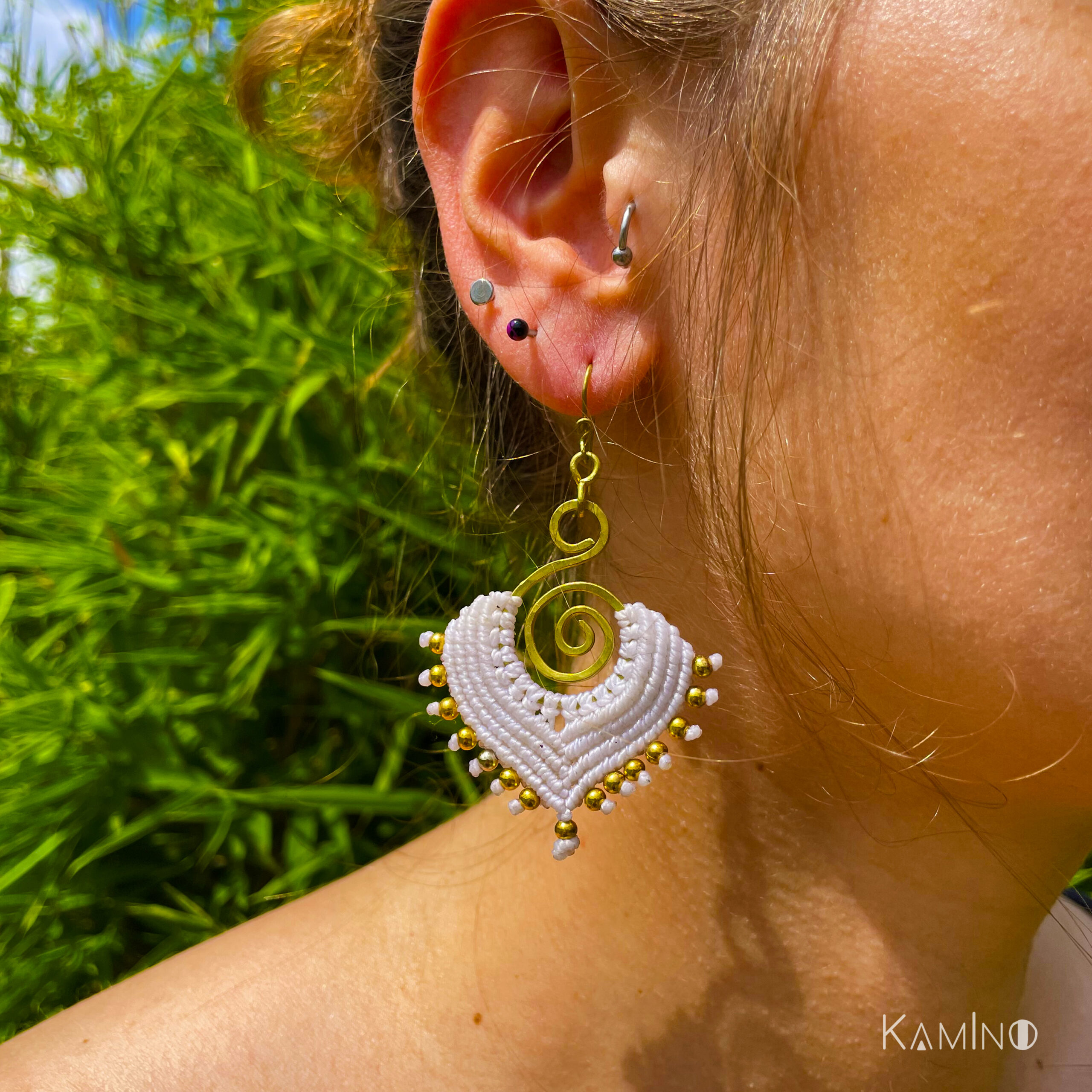 Belles boucles d’oreilles en macramé. Fabriquées à la main de façon artisanales en Equateur. Couleur : blanc