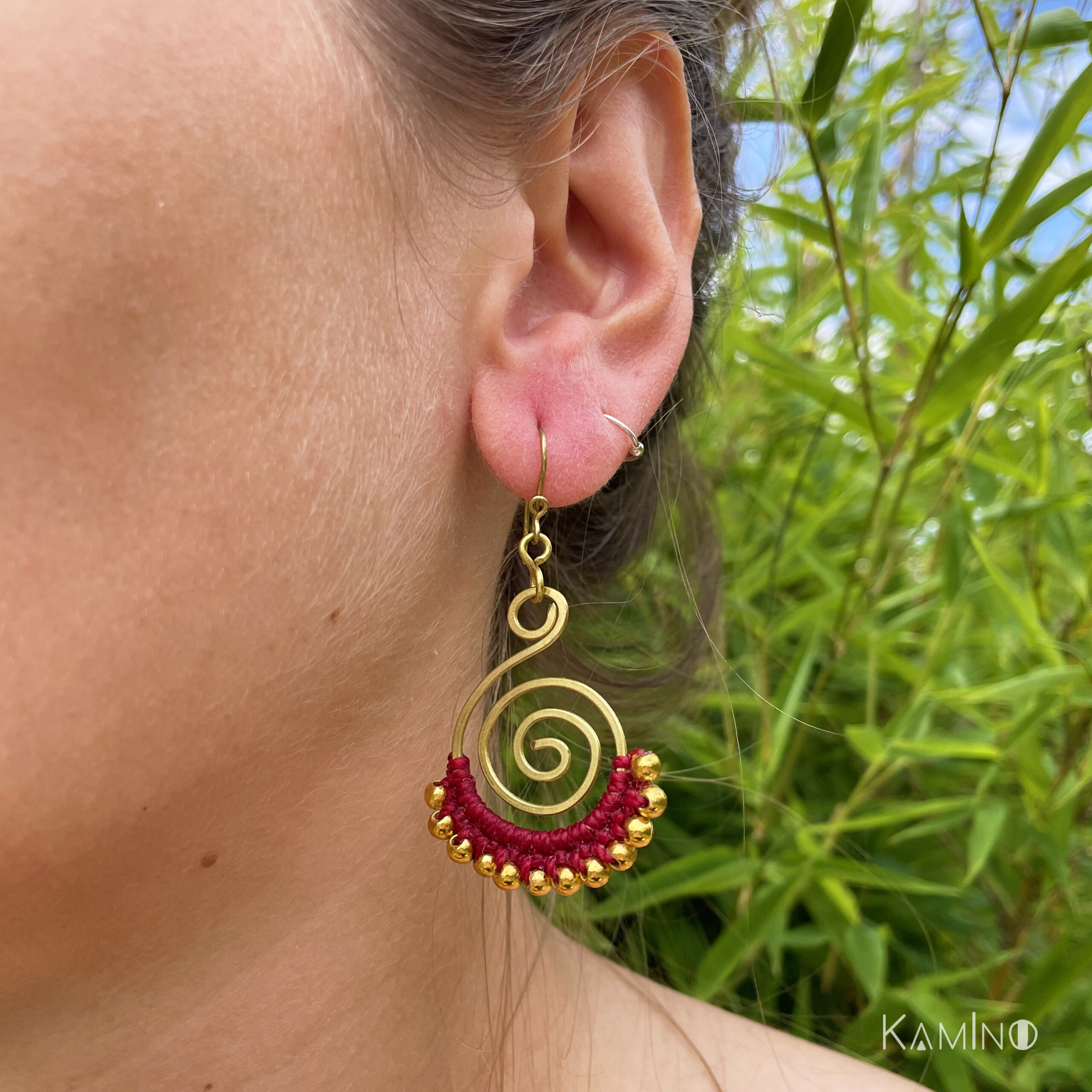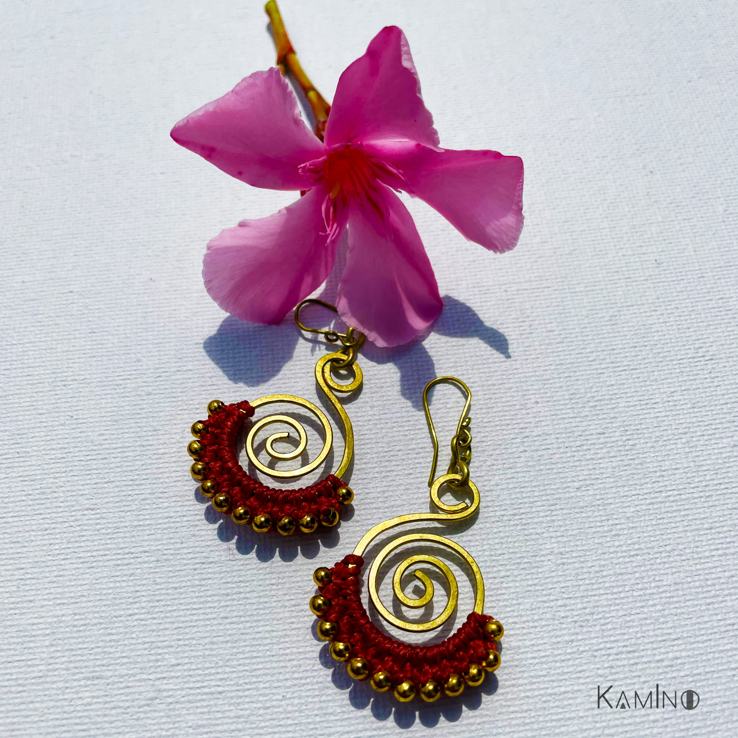 Belles boucles d’oreilles en macramé. Fabriquées à la main de façon artisanales en Equateur. Couleur : rouge